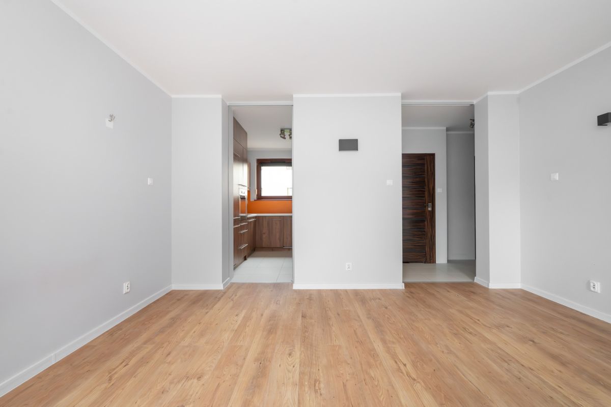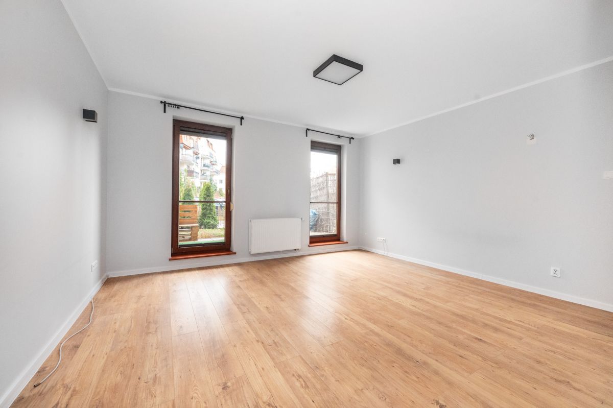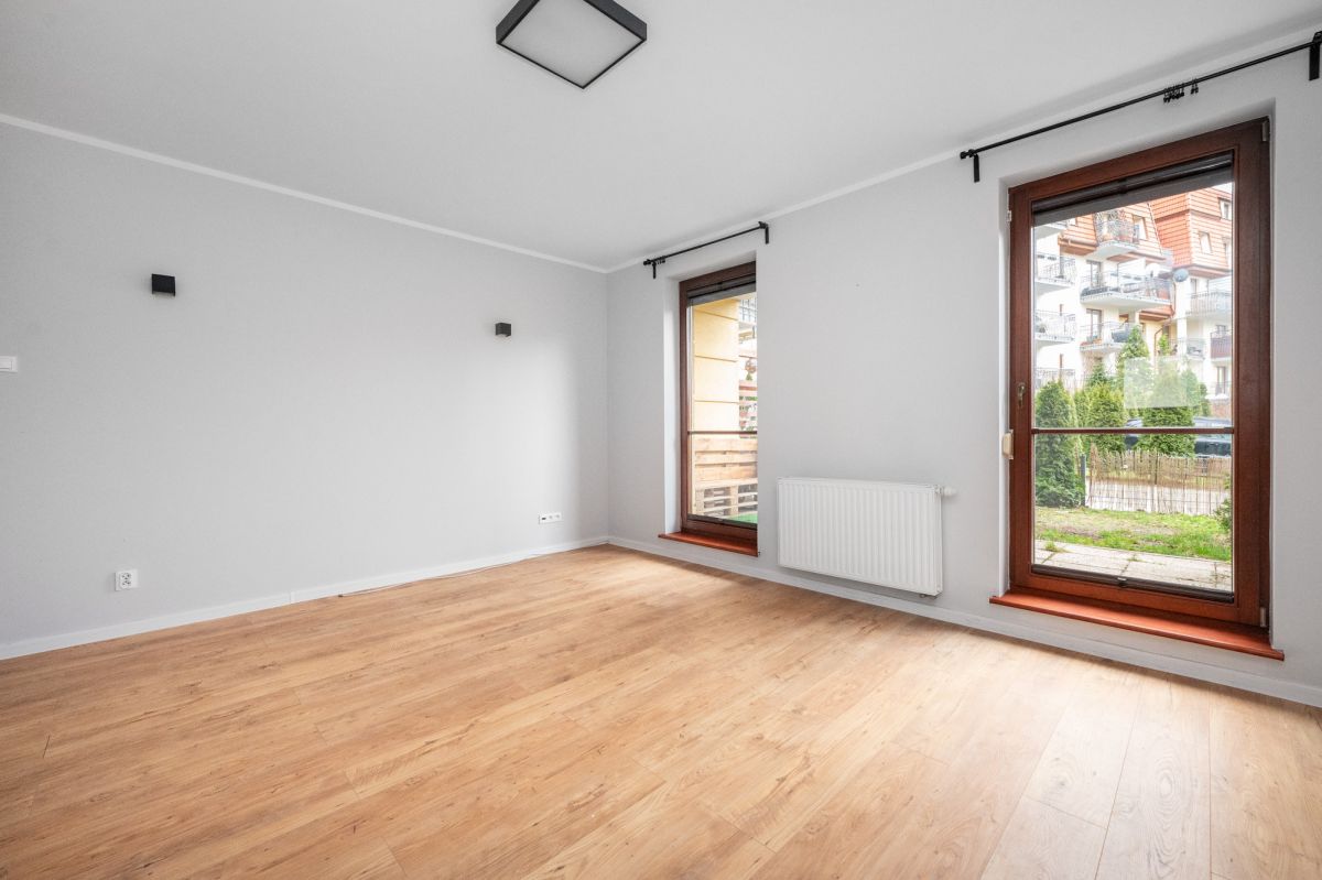 - Układ: przestronny salon z wyjściem na duży taras i ogródek (ok. 30 m²), sypialnia, oddzielna kuchnia, łazienka, przedpokój