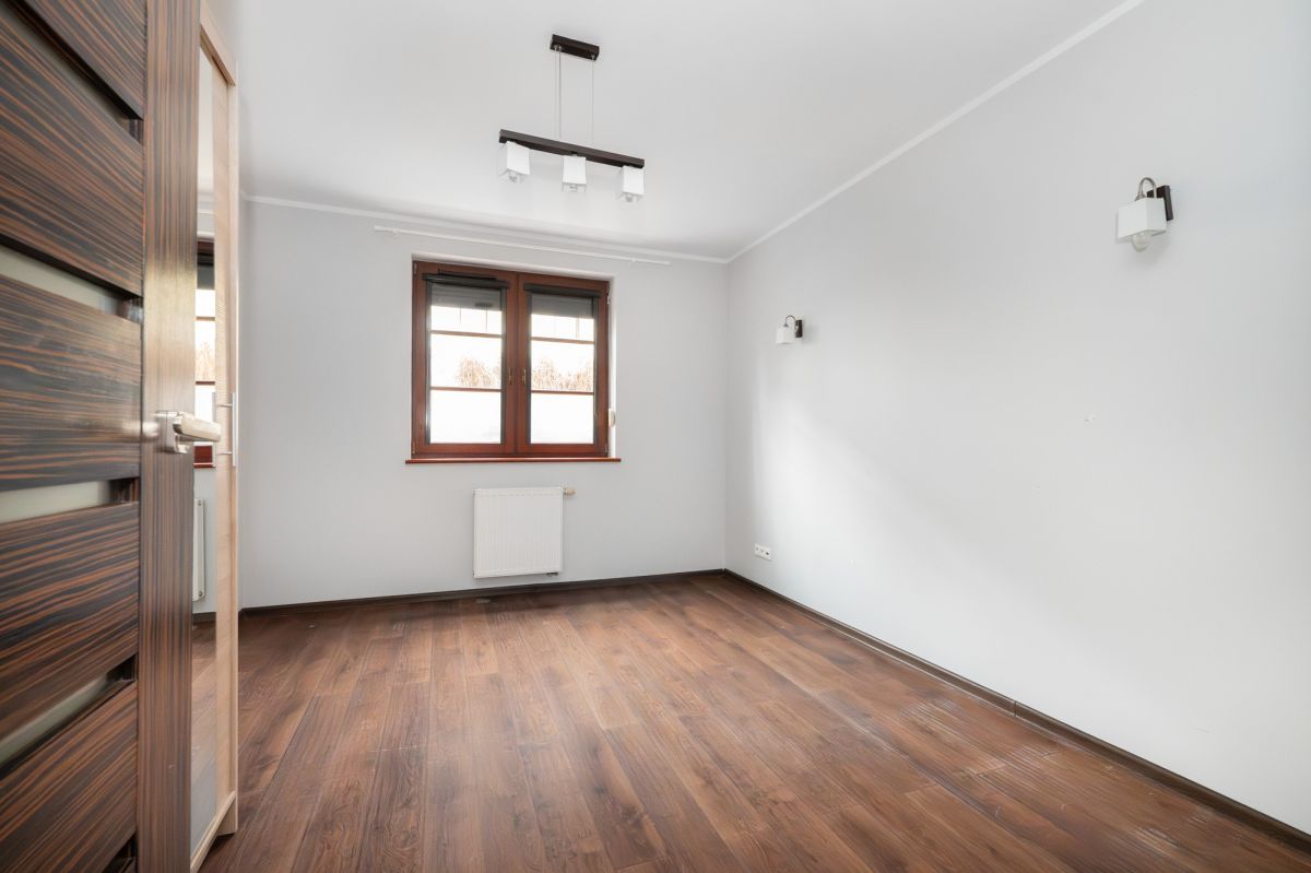 - Wysoki standard wykończenia: drewniane okna, panele/terakota, zewnętrzne rolety antywłamaniowe