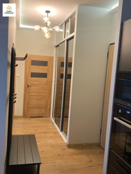- Wyposażenie mieszkania obejmuje narożnik rozkładany, wersalkę, łóżko w sypialni oraz zabudowę garderobianą w przedpokoju