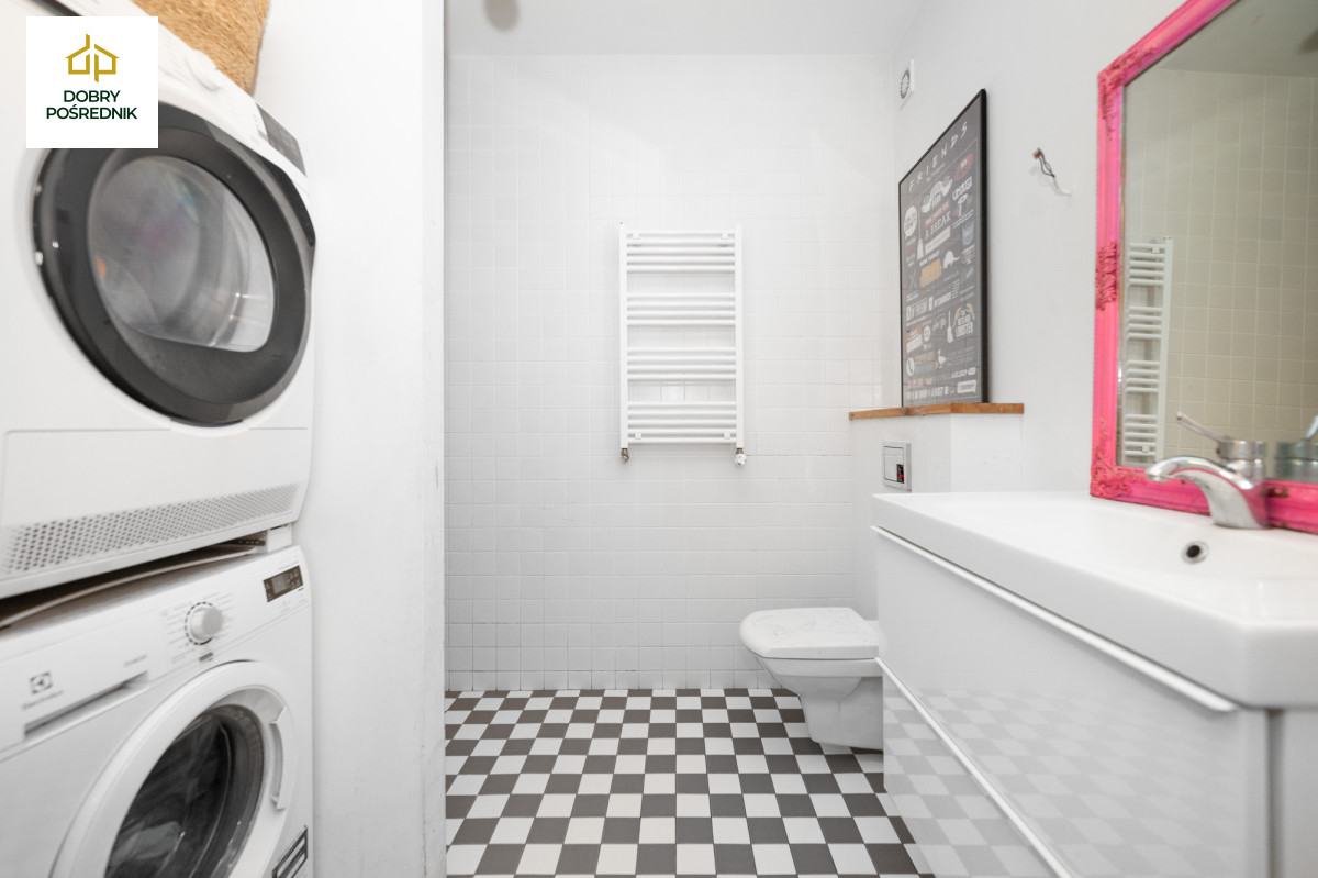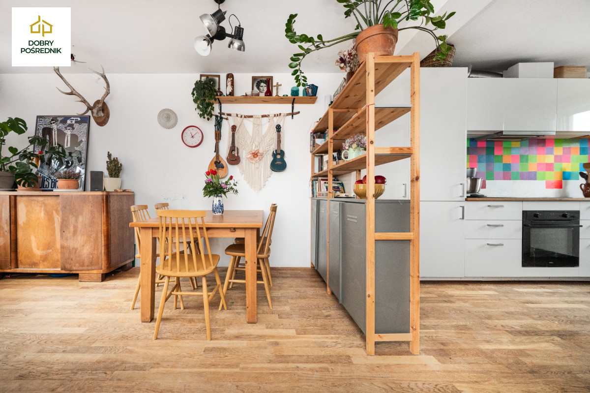 Zabudowana kuchnia w pełni wyposażona w sprzęt AGD, płyta indukcyjna, zmywarka, okap, lodówka, piekarnik. Całość zaprojektowana w nowoczesnym stylu.