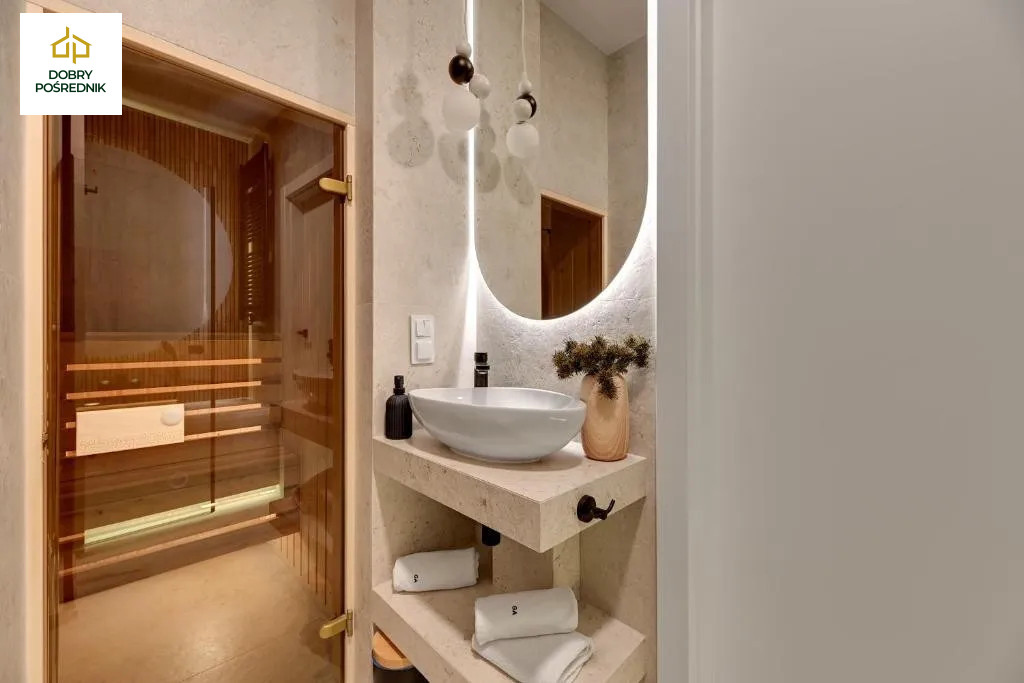 - Luksusowa strefa relaksu z wanną z hydromasażem, prysznicem i prywatną sauną