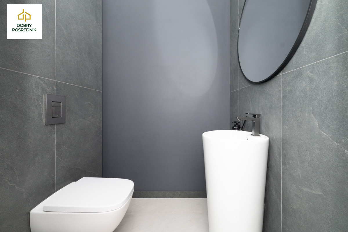 Z podwieszanym WC (Geberit), wolnostojącą umywalką i ozdobnym oświetleniem - stanowi praktyczne i estetyczne uzupełnienie strefy dziennej.