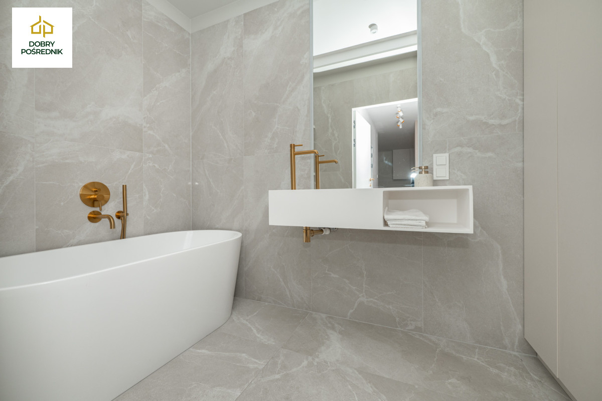 Elegancka i przestronna - z wolnostojącą wanną, armaturą Omnires, umywalką podwieszaną, lustrem z oświetleniem LED oraz zabudową z miejscem na pralko-suszarkę. Wszystko w wysokim standardzie i spójnej stylistyce.