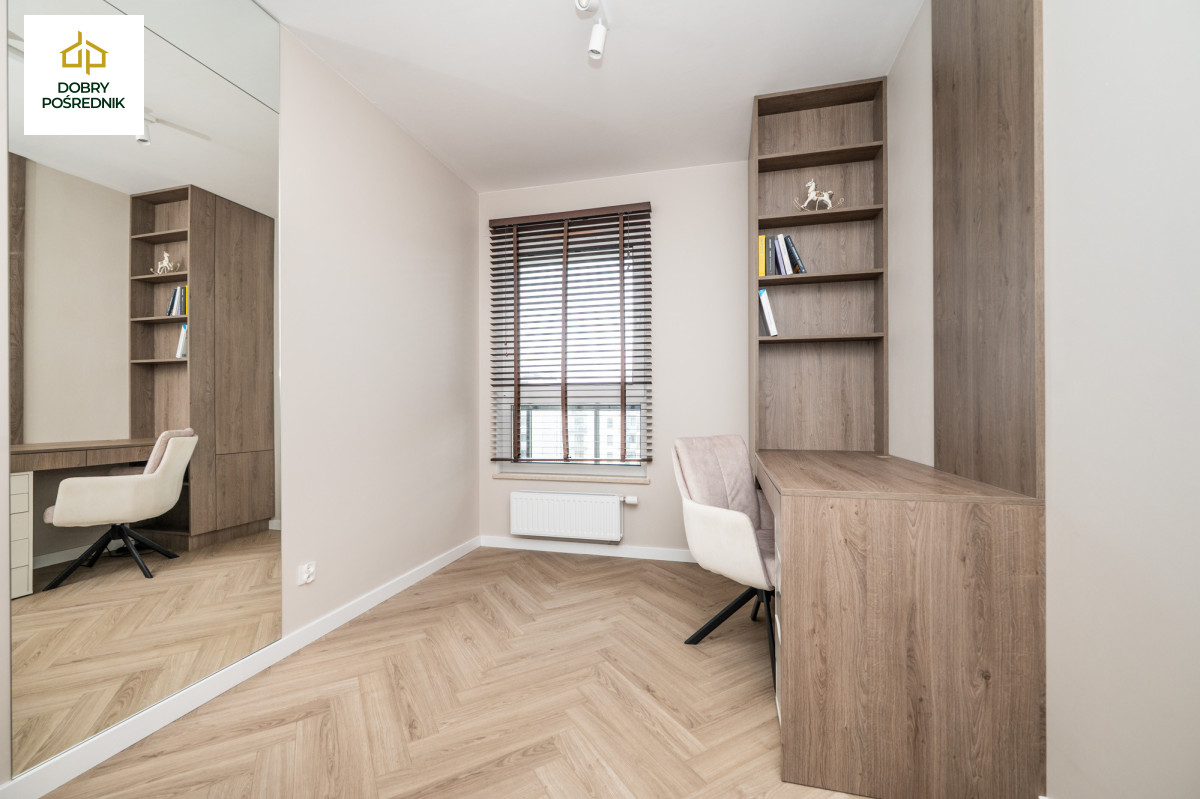 Zaaranżowany jako gabinet lub pokój gościnny - wyposażony w meble na wymiar (biurko, szafa, regał) wraz z dużym lustrem