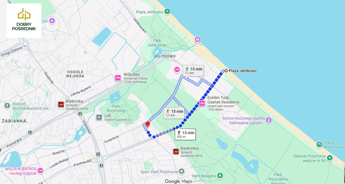 - plaża w Jelitkowie (ok. 800 m),
