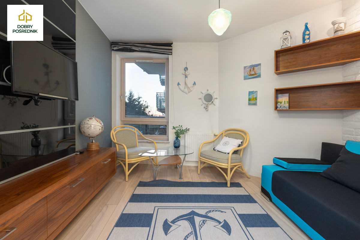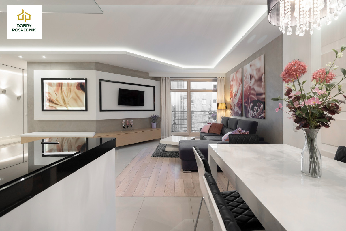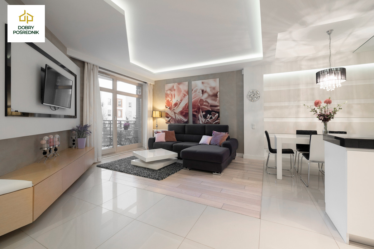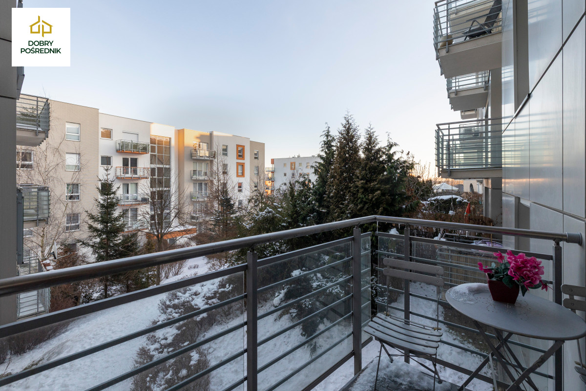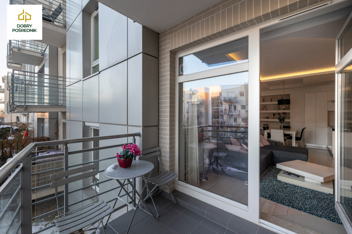 Z salonu wyjście na cichy balkon z elementami zieleni. Wysokiej klasy sprzęty AGD oraz starannie dobrane materiały wykończeniowe podkreślają nowoczesny charakter wnętrza.