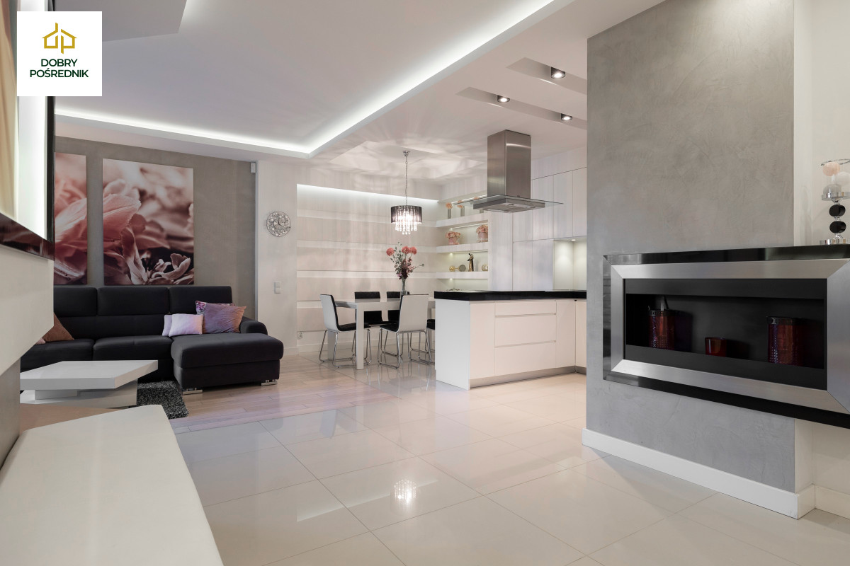 - Przestronny salon z aneksem kuchennym i biokominkiem oraz wydzielona jadalnia