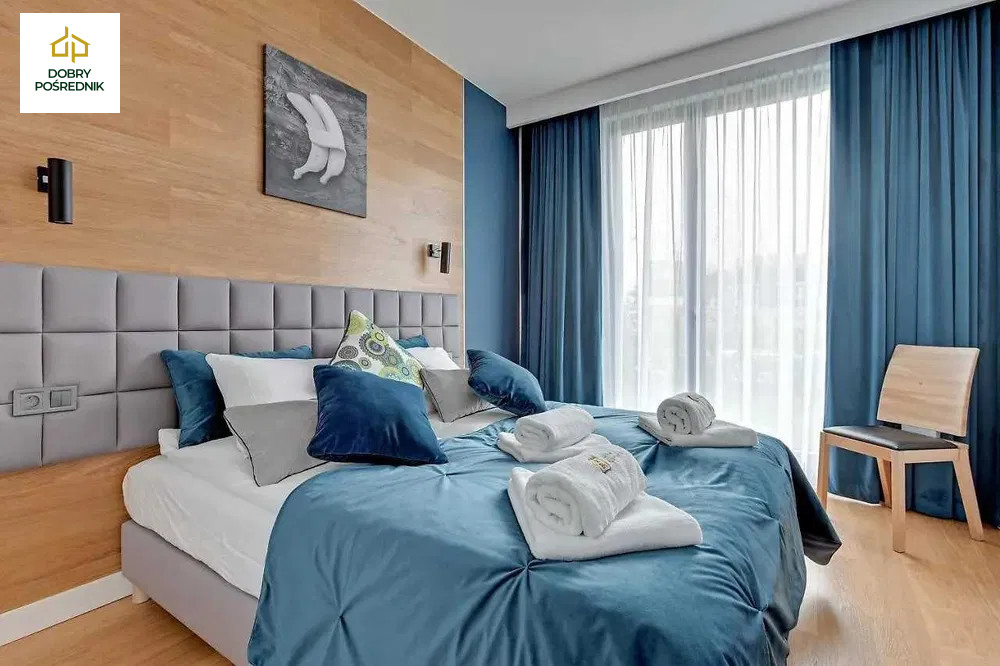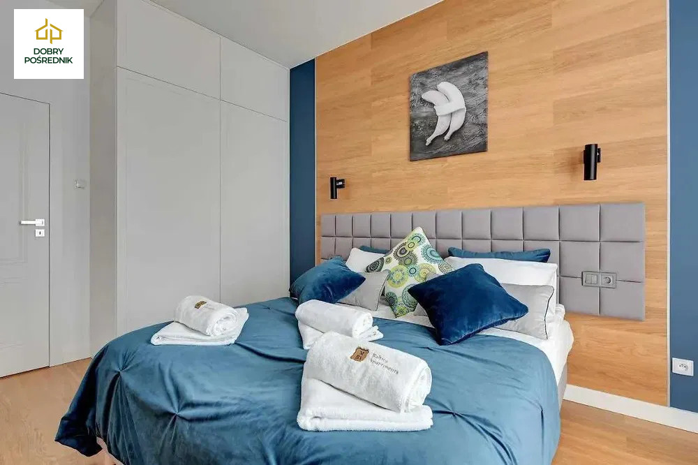 Apartament jest w pełni umeblowany i wyposażony w sprzęt AGD oraz elementy codziennego użytku (m.in. pościel, ręczniki, żelazko).