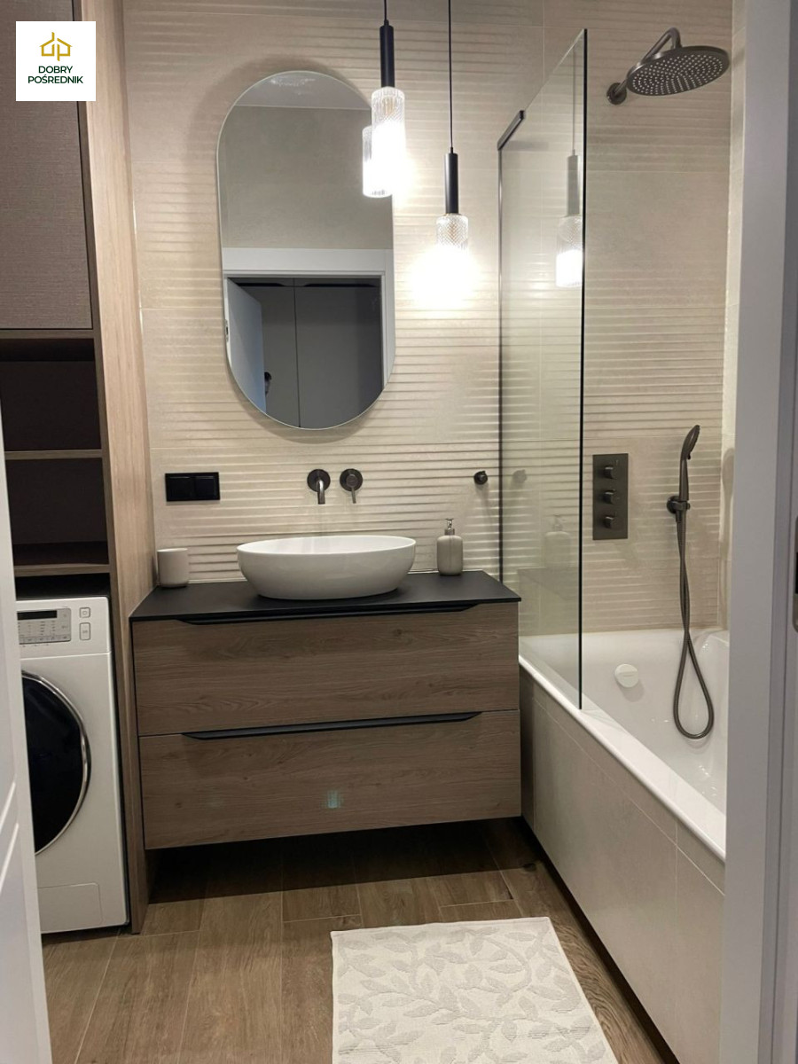 - Eleganckiej łazienki z wanną z funkcją prysznica, WC oraz pralko-suszarką